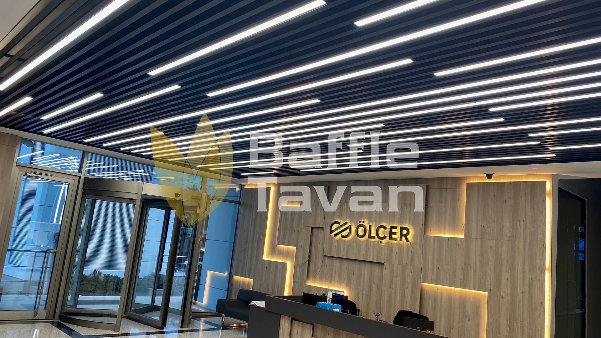 Linear tavan sistemleri, standart renklerde baffle tavan ile entegre edilerek mekanın tasarımında renk ve hareketlilik yaratır. Bu kombinasyon, özellikle yaratıcı ve modern projelerde fark yaratır.