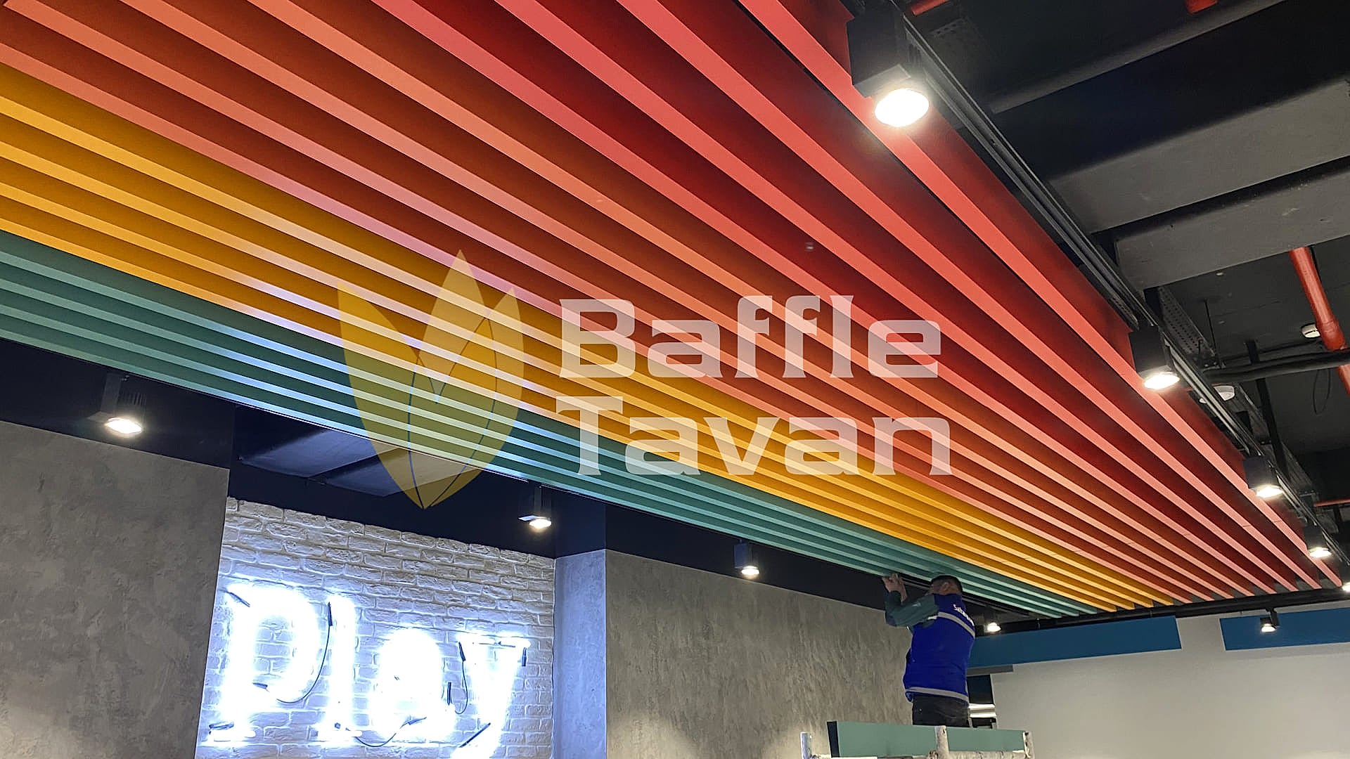 Standart renklerde baffle tavan sistemleri; alışveriş merkezleri, spor salonları, okullar, hastaneler, konser salonları ve ofislerde sıklıkla tercih edilir. Farklı renk seçenekleri, her mekânın ihtiyacına özel tasarım yapmayı mümkün kılar.